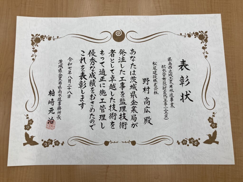 本工事では、2025年度 茨城県企業局主任(監理)技術者表彰【水道事務所長表彰】を受賞致しました。