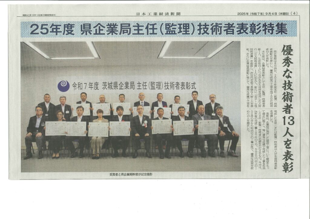 弊社で施工しました、茨城県企業局県南水道事務所発注:配水管布設(耐震化)工事において 【水道事務所長賞】を受賞致しました。 日本工業経済新聞様の9月4日号に掲載されました。 この賞を励みに、今後もより良い施工と品質を目指して、正確な施工管... -